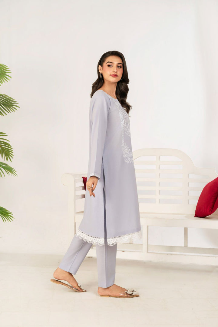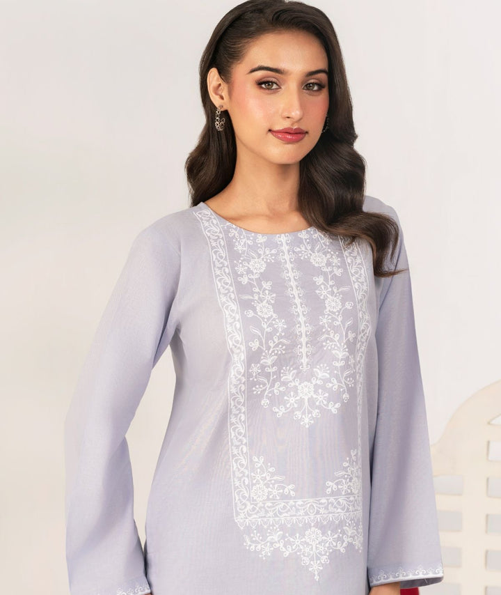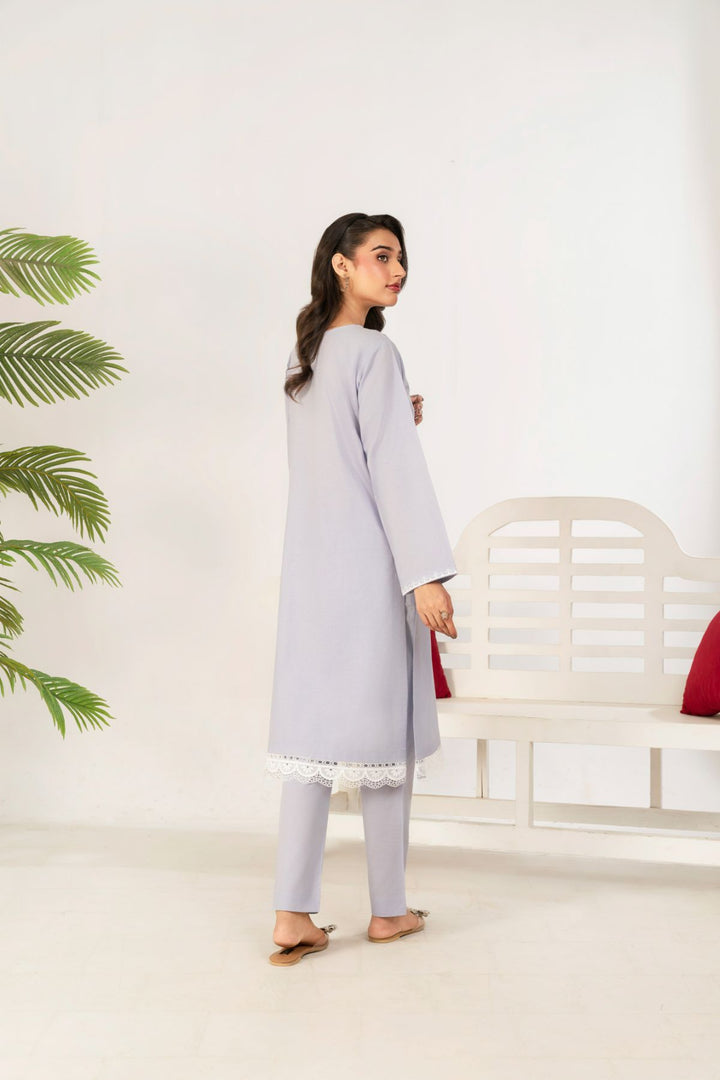 Give yourself a stunning look with this incredible light purple outfit, consisting prety embroidery on neck,sleeves & lace detailing made from lawn.