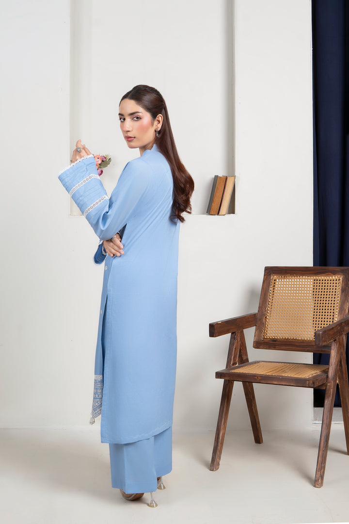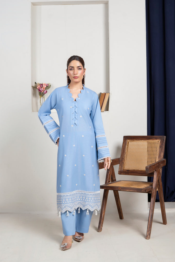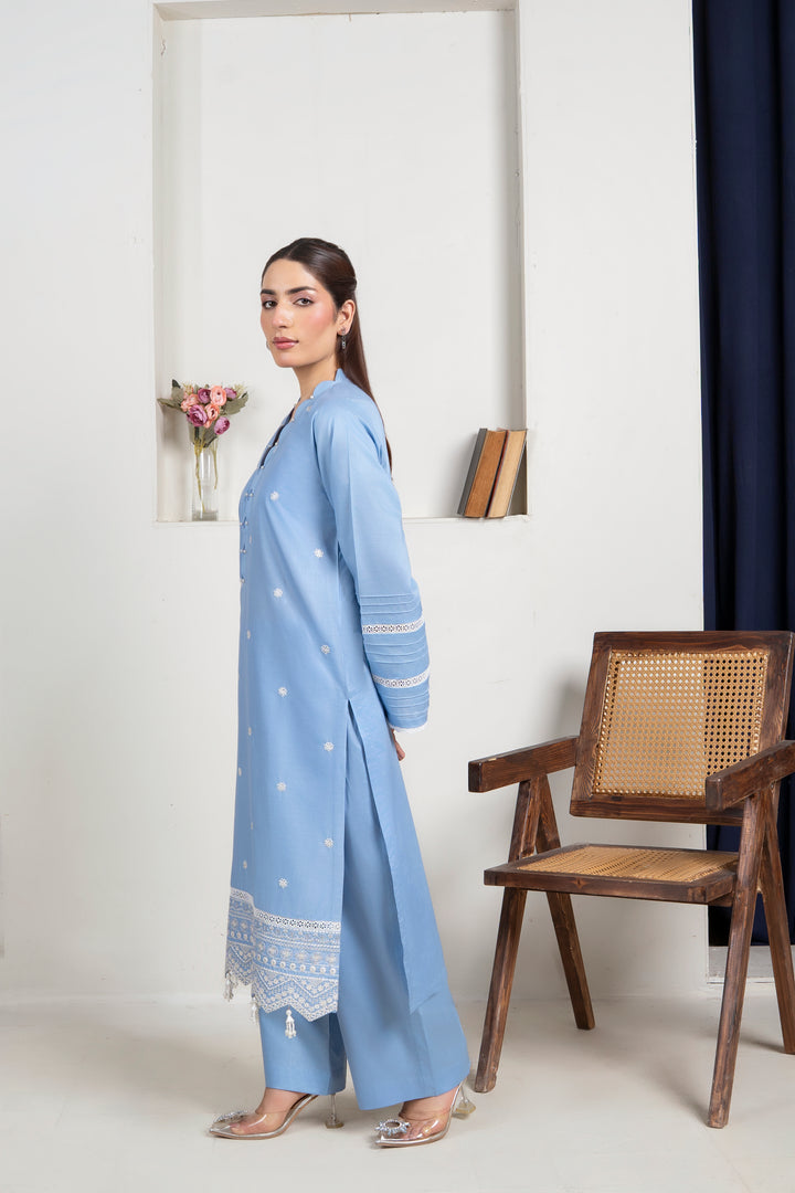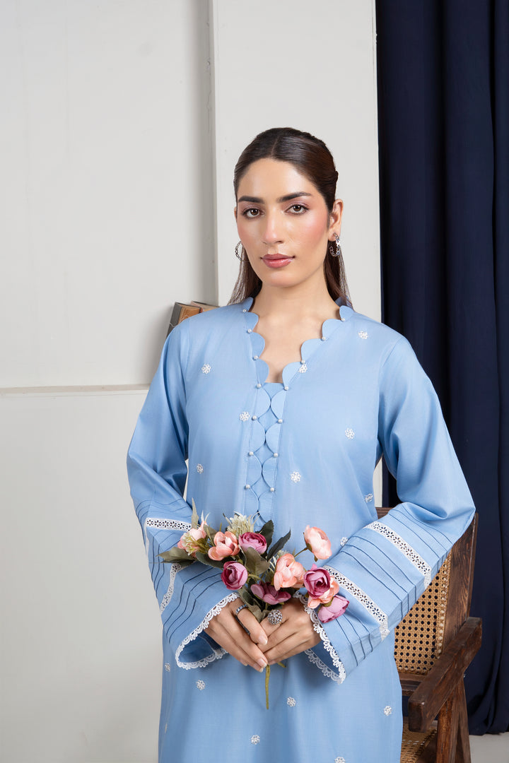 This elegant two-piece Kurta Set by Ahlam By Safa Textile is perfect for daily wear during the summer season. The sky blue lawn fabrics create a soft and comfortable feel, with a straight Kurta top and straight trouser bottom for a sleek look. The attached lining adds a polished touch to this versatile ensemble. Ideal for any casual occasion.