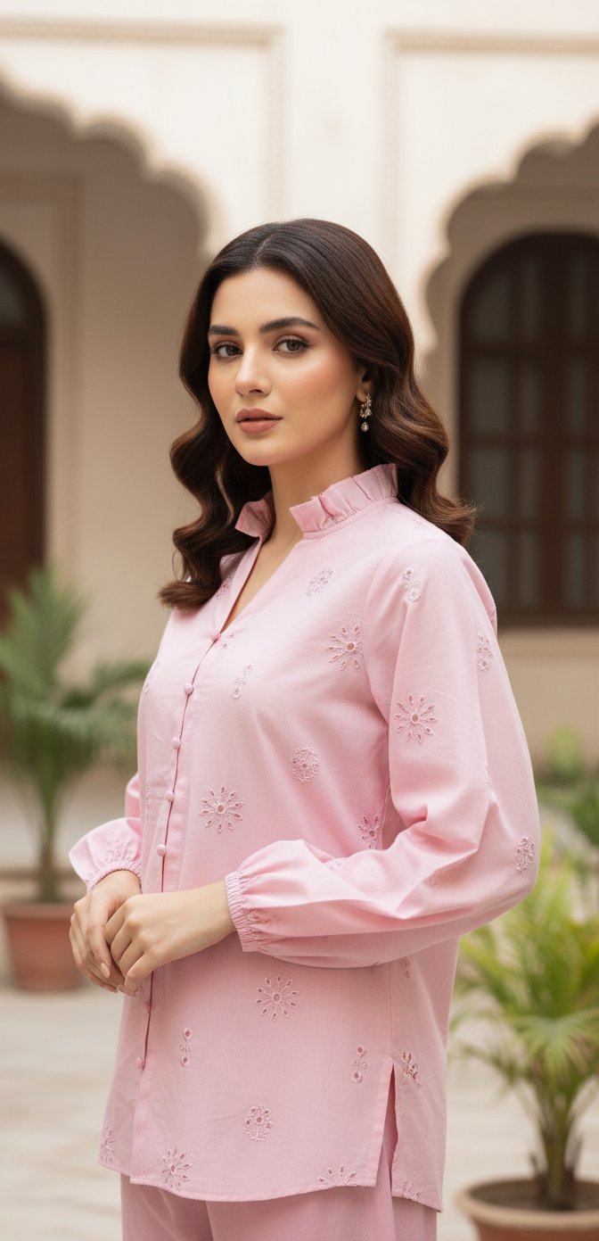 Elevate your style statement with our Baby-Pink Shirt accented with Chicken-Kari and stitching details.