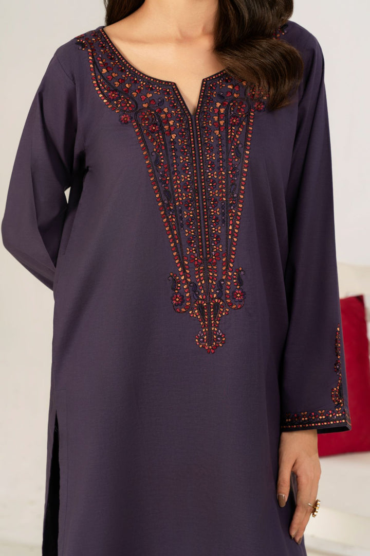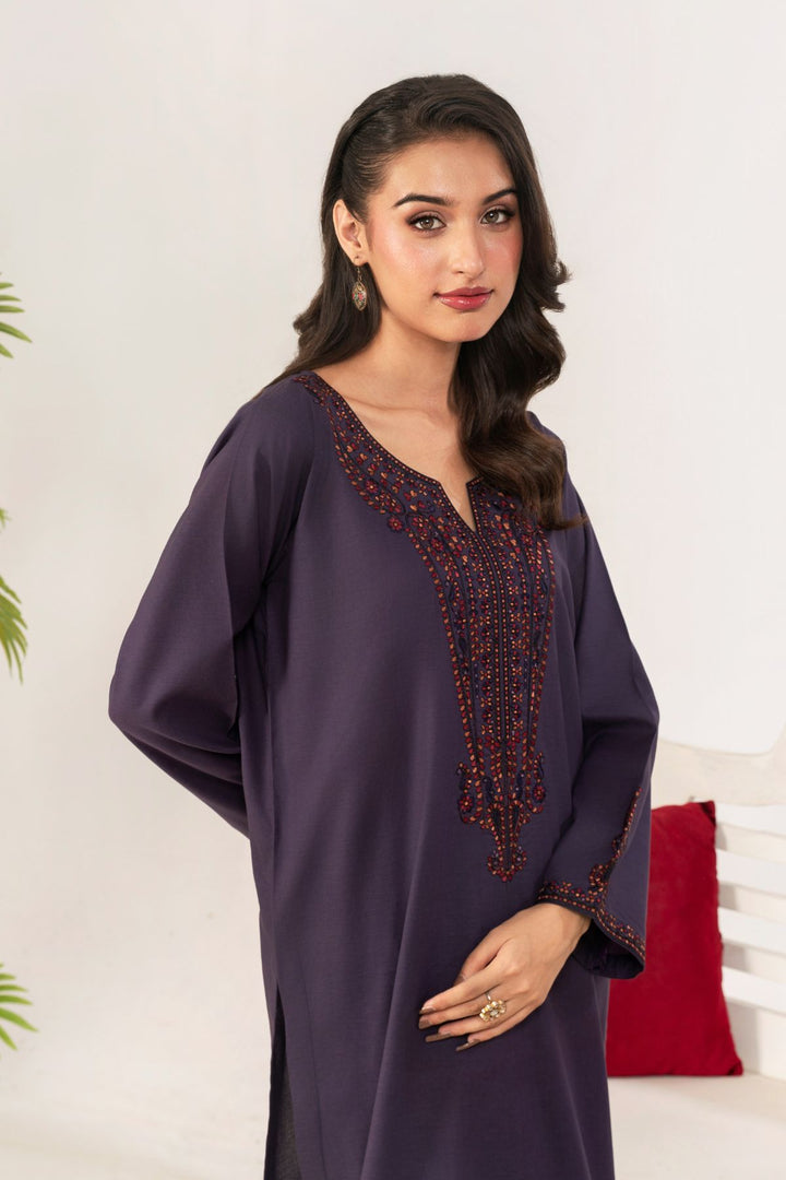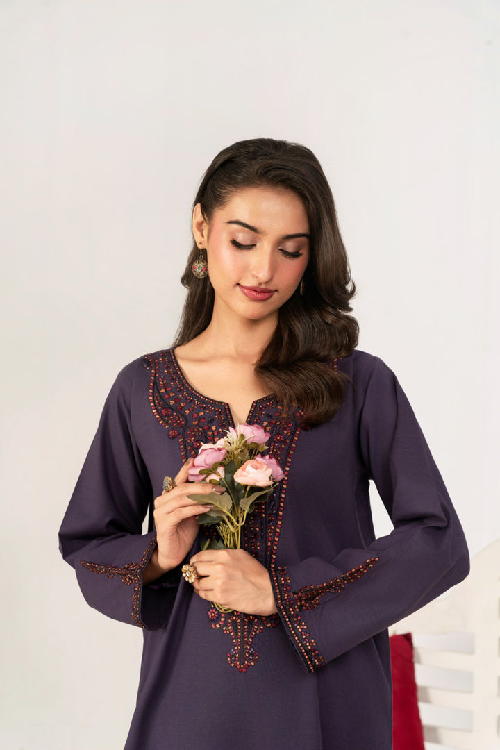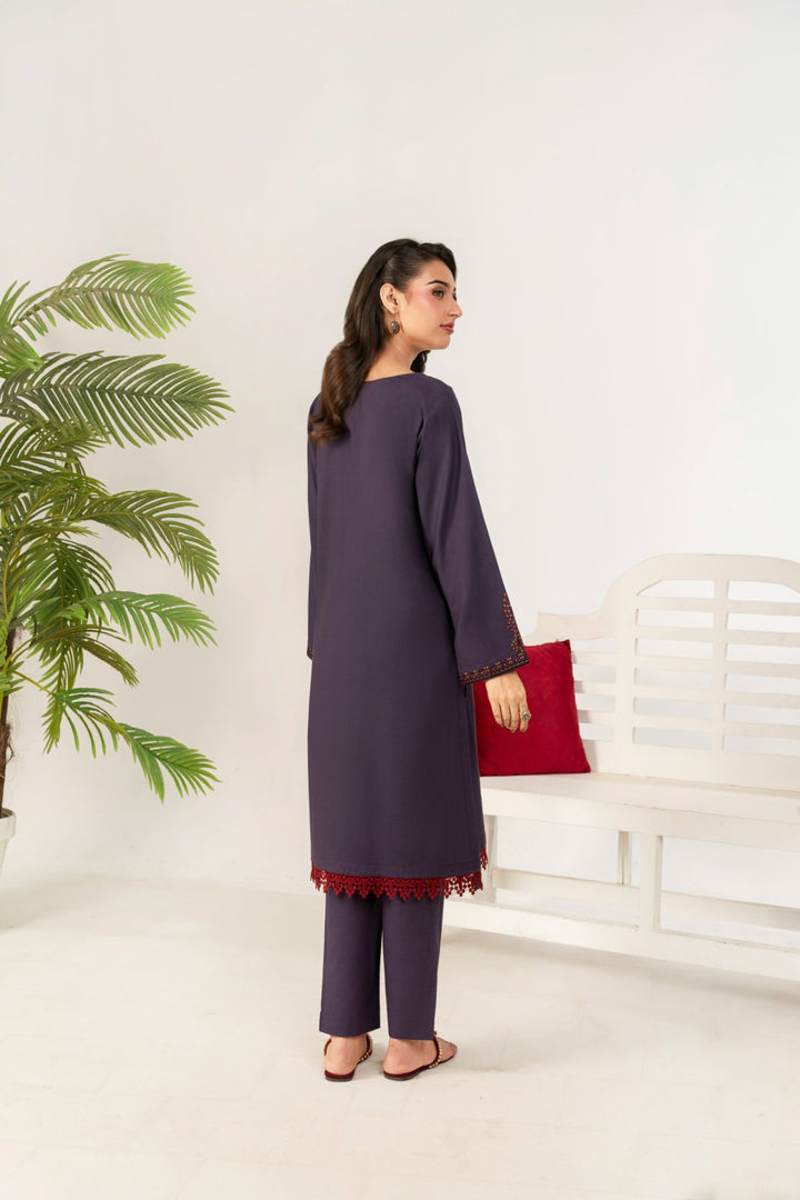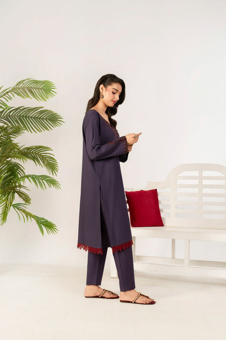 GIve yourself a stunning look with this incredible purple outfit, consisting prety embroidery on neck,sleeves & lace detailing made from lawn.