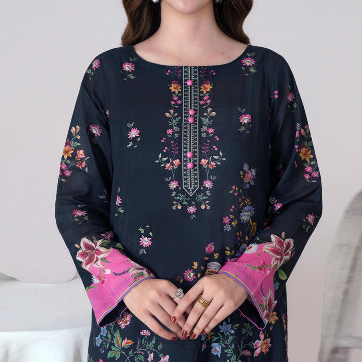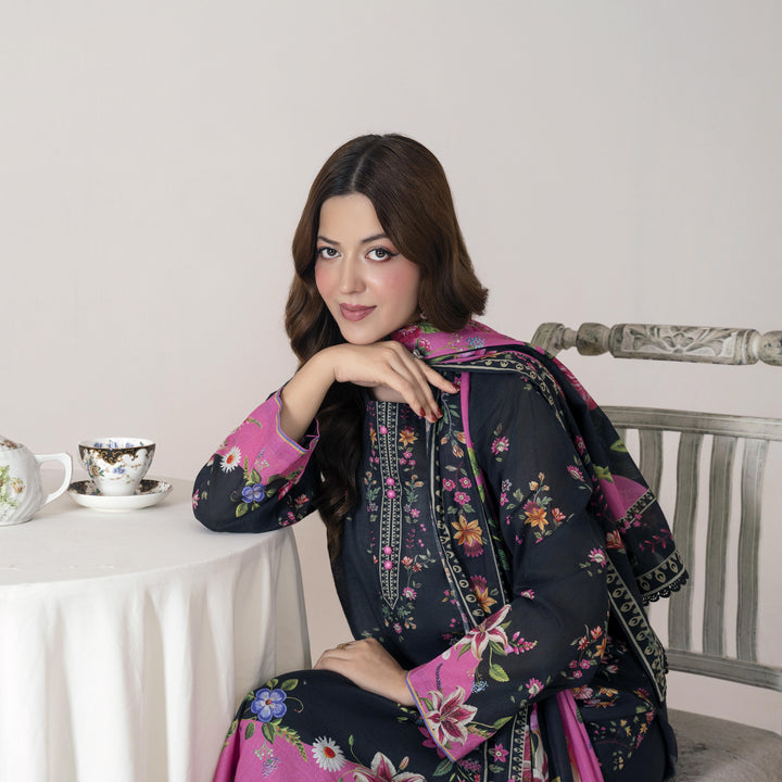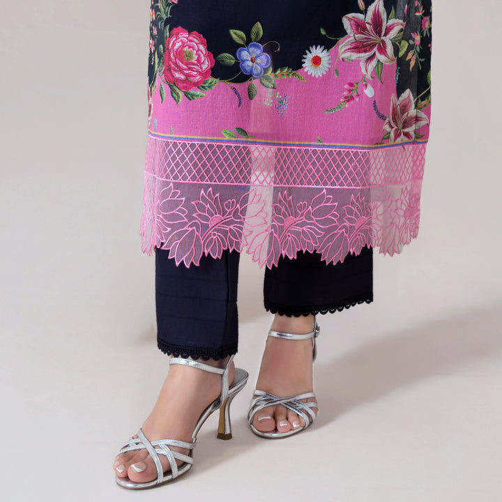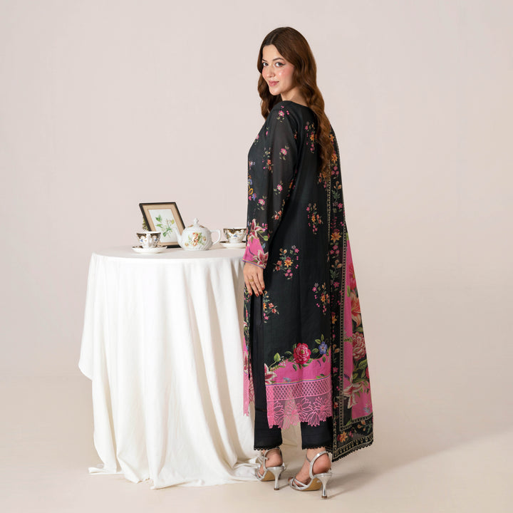Elevate your style statement with our Black with Floral Print 3pc accented with digital print and lace detailing.