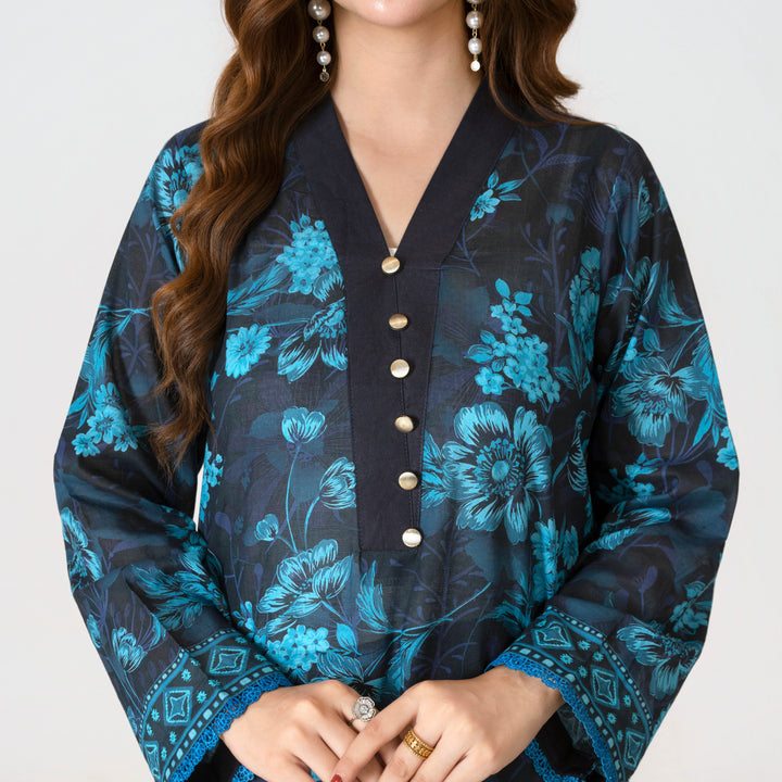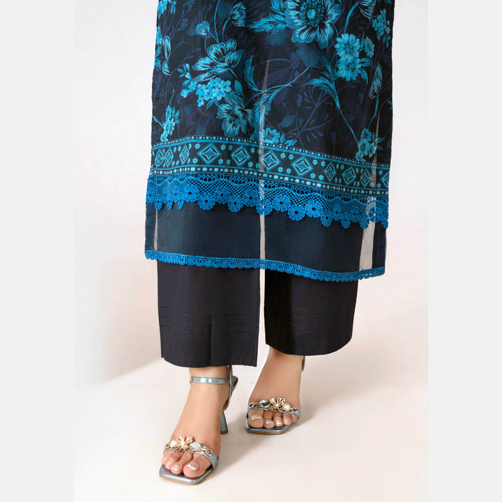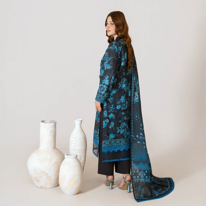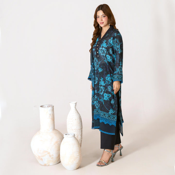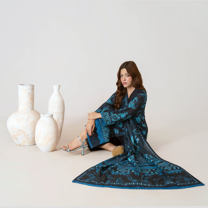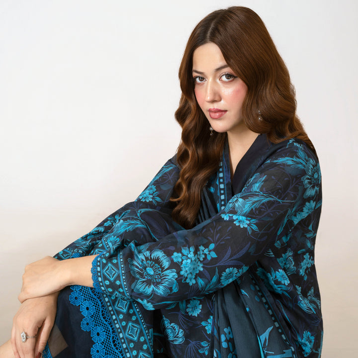 Elevate your style statement with our Dark-Blue with Floral Print 3pc accented with digital print and lace detailing.